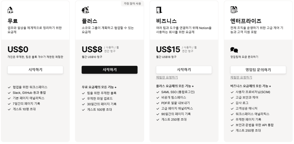<그림: 제공하는 기능에 따라 차별화 되어있는 노션의 가격 정책1>