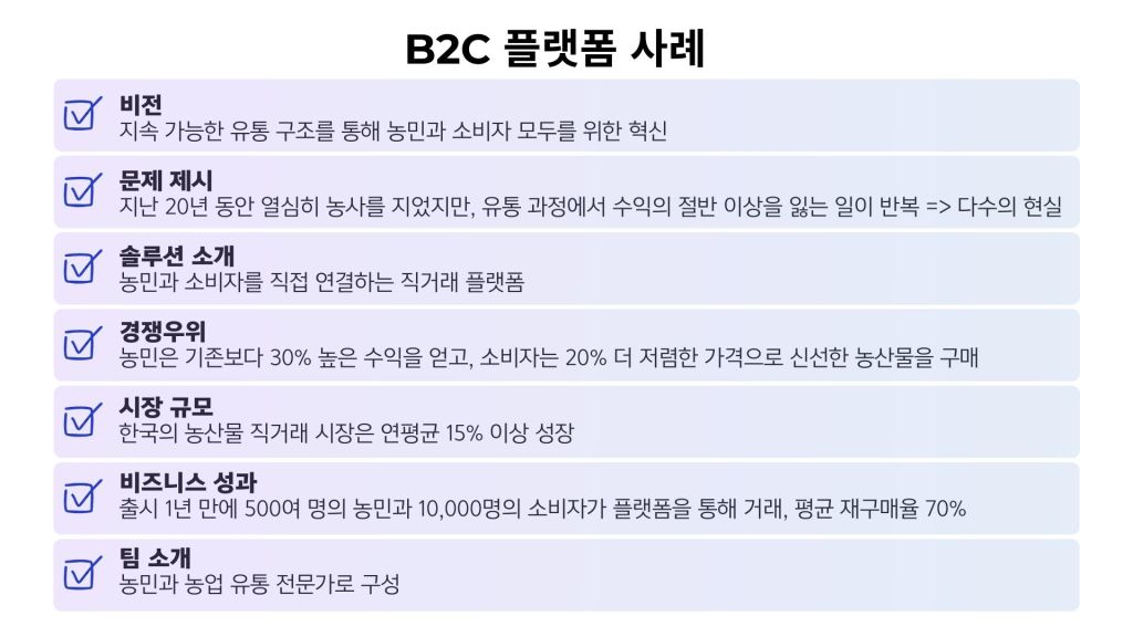 - 해결책으로 전환: 당신의 솔루션이 문제를 어떻게 해결하는지 간결하게 설명하세요예: “저희 플랫폼은 유통 단계를 줄이고, AI로 수요를 예측해 폐기물을 최대 30% 줄입니다.”