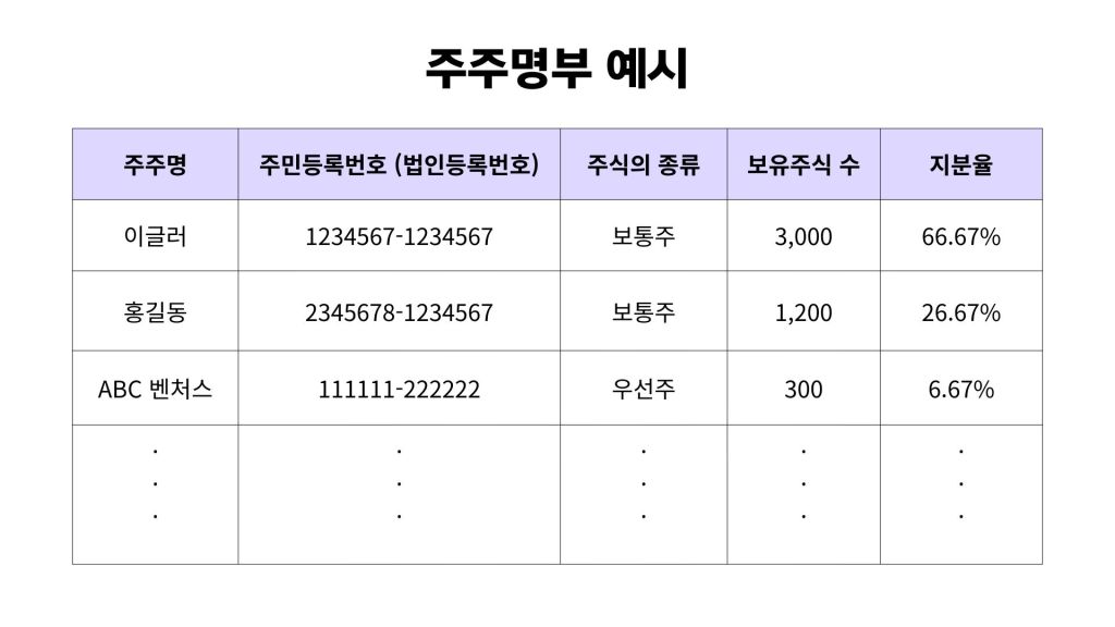 - 주주 권리(의결권, 배당권 등)는 반드시 주주명부를 기준으로 행사됩니다.
