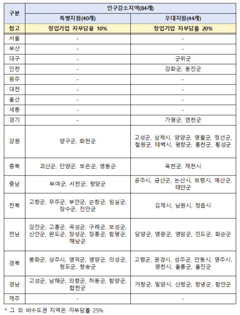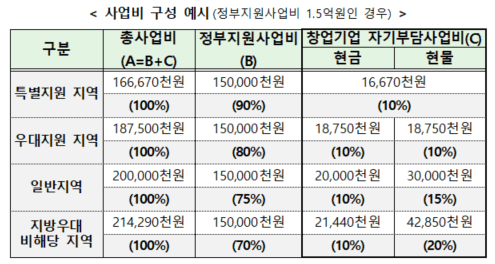 2026년 부터는 창업기업 사업장 소재지를 기준으로 지방우대 지역(특별지원 지역, 우대지원 지역, 일반지역)과 지방우대 비해당 지역으로 구분하여 자기부담 사업비를 차별을 둡니다.